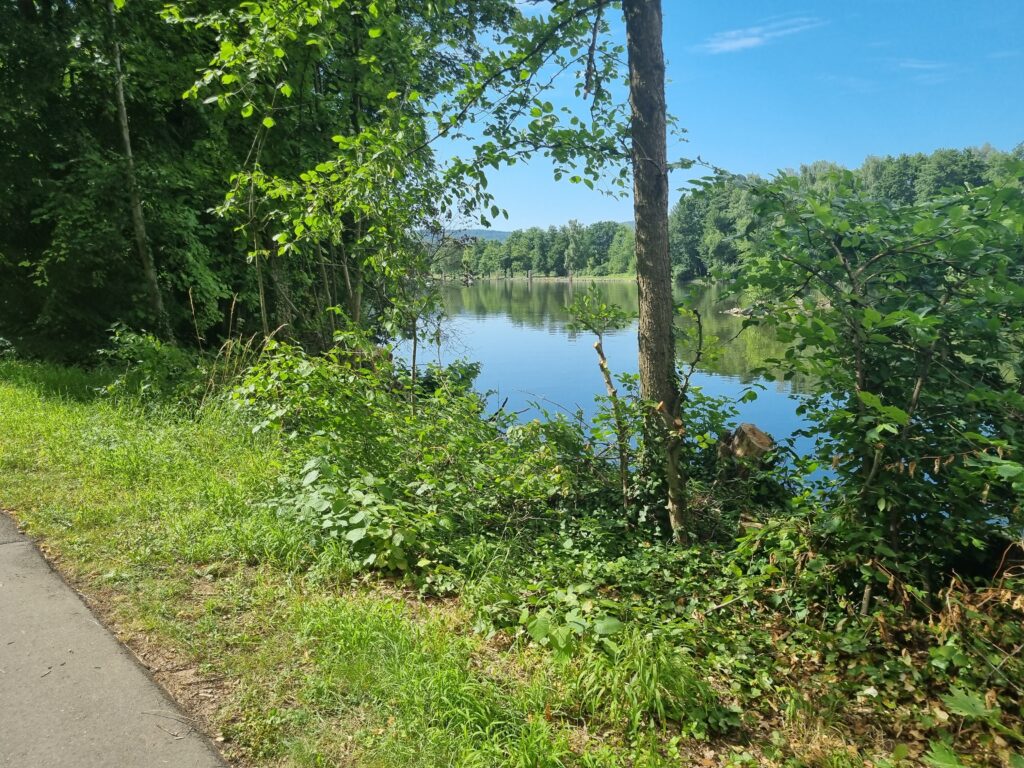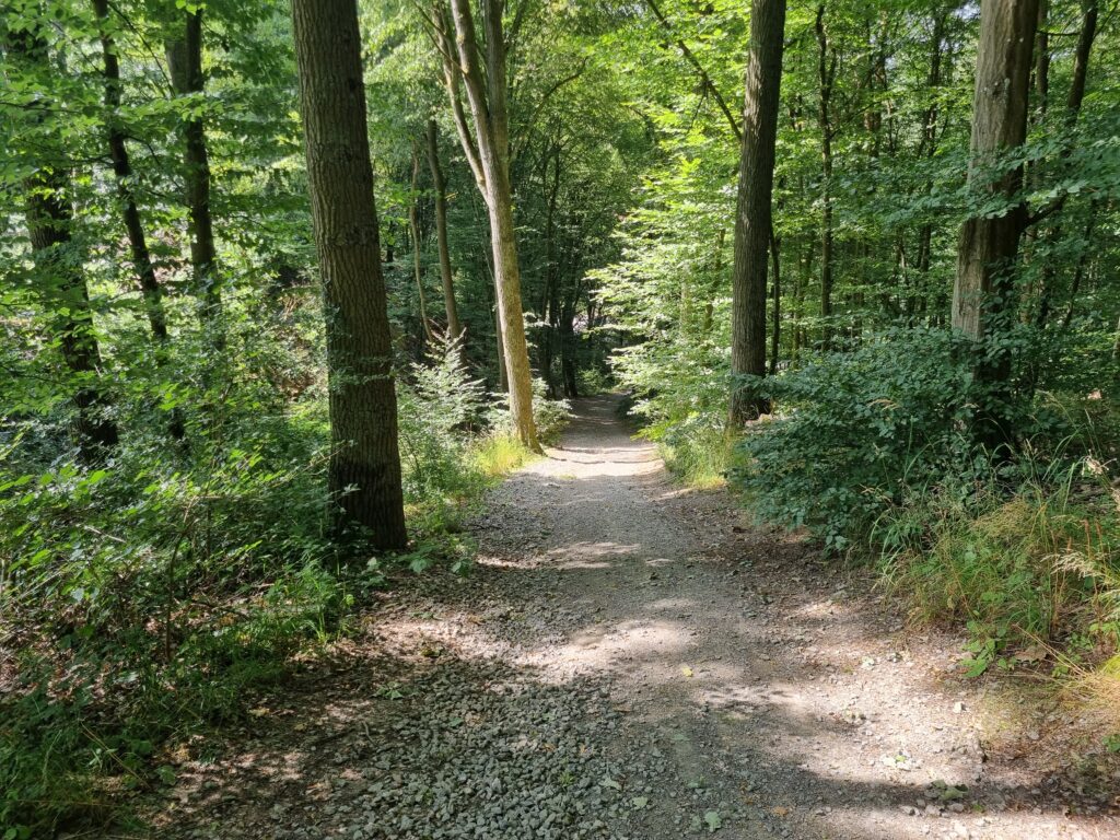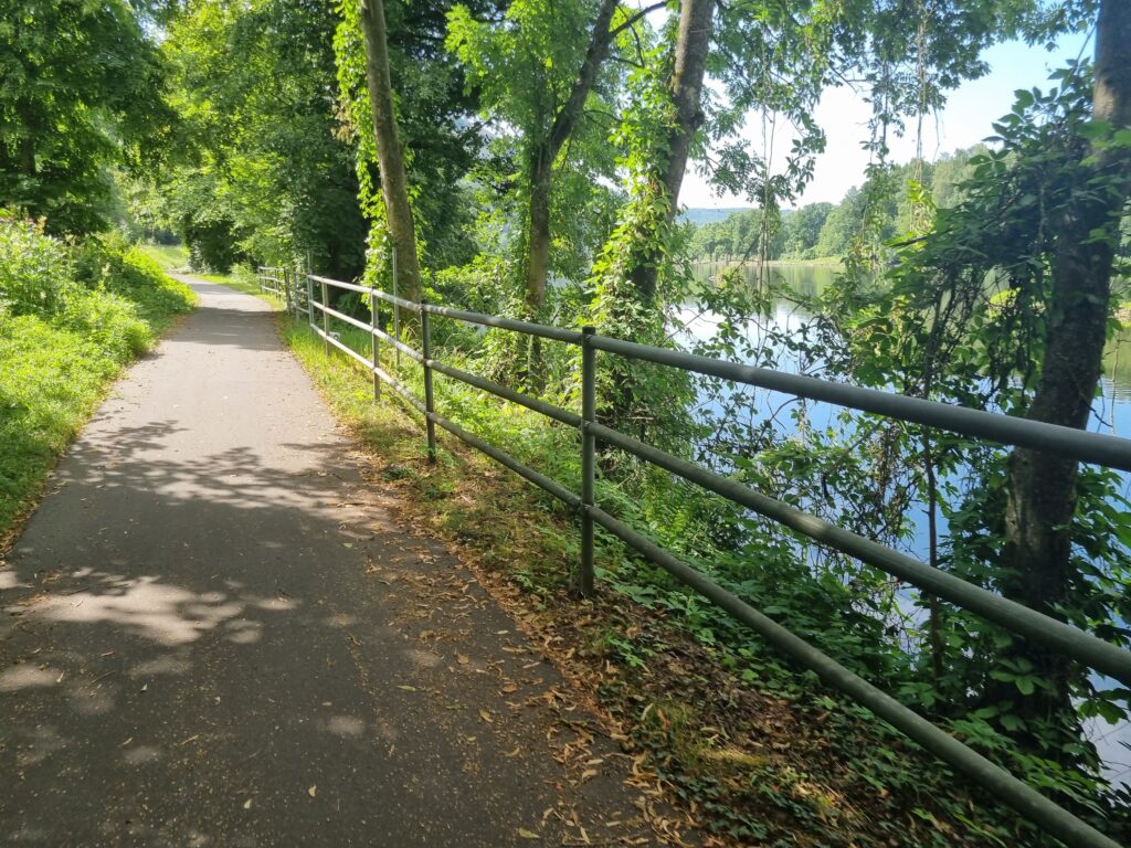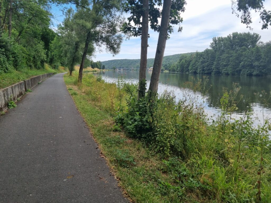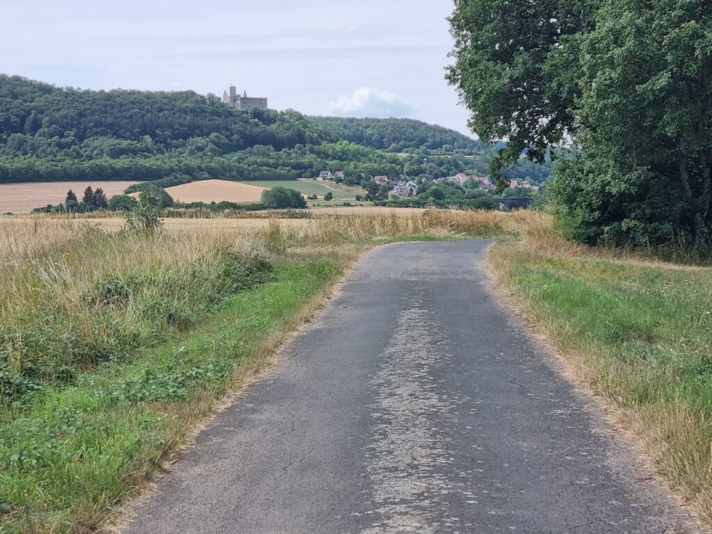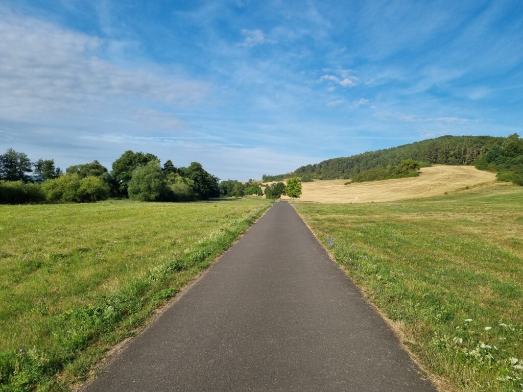 In Bad Kissingen sollte ich eigentlich über einen Berg rausfahren. Klug, wie ich glaubte zu sein, wollte ich einfach im Tal der Fränkische Saale bleiben, bis meine geplante Route wieder ins Tal kam. Ich denke ich sparte ein paar Höhenmeter, dafür gings über eine echte Gravel-Strecke, mit Schiebe-Passagen.