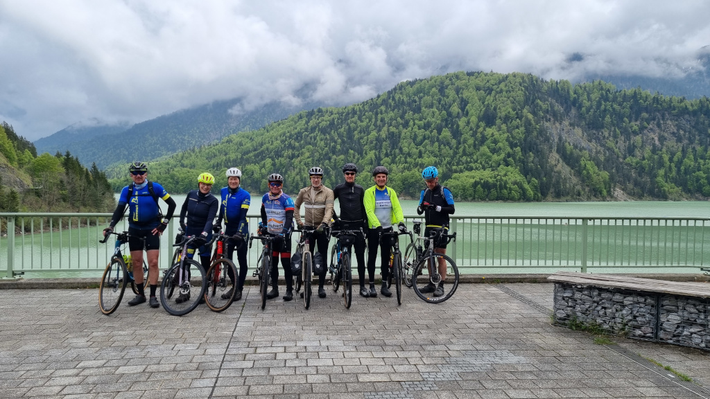 Nun wieder flussnah vorbei an Bad Tölz und mit einem Seitenwechsel bei Obergries freuten wir uns auf Labsal im Gasthof Pfaffensteffl in Lenggries, wo Holger eine zünftige bayerische Brotzeit mit Wurst, Schinken, Käse, Rettichraspeln, Getränken und Kaffee für uns organisiert hatte. Großen Dank an den edlen Spender! Als besonderes Schmankerl hatte er einen alten Freund eingeladen, den zweimaligen Fahrrad-Olympioniken und vielfachen Meister der 60er Jahre Burkhard Ebert (https://de.wikipedia.org/wiki/Burkhard_Ebert), mit dem wir angeregt plauderten. Wann trifft man schon mal eine solche historische Gestalt des Sports mit Wikipedia-Eintrag, deren Leistungen mit einfachster Fahrradtechnik uns komfortverwöhnten Hightech-Radlern immer wieder Hochachtung abnötigen. Mit gebunkerten Kalorien und den niedrigen Temperaturen um die 7 Grad trotzend, bewegten wir uns überwiegend auf Gravel-Strecken südwärts und erreichten den sich eindrucksvoll in der Berglandschaft erstreckenden Sylvensteinsee.