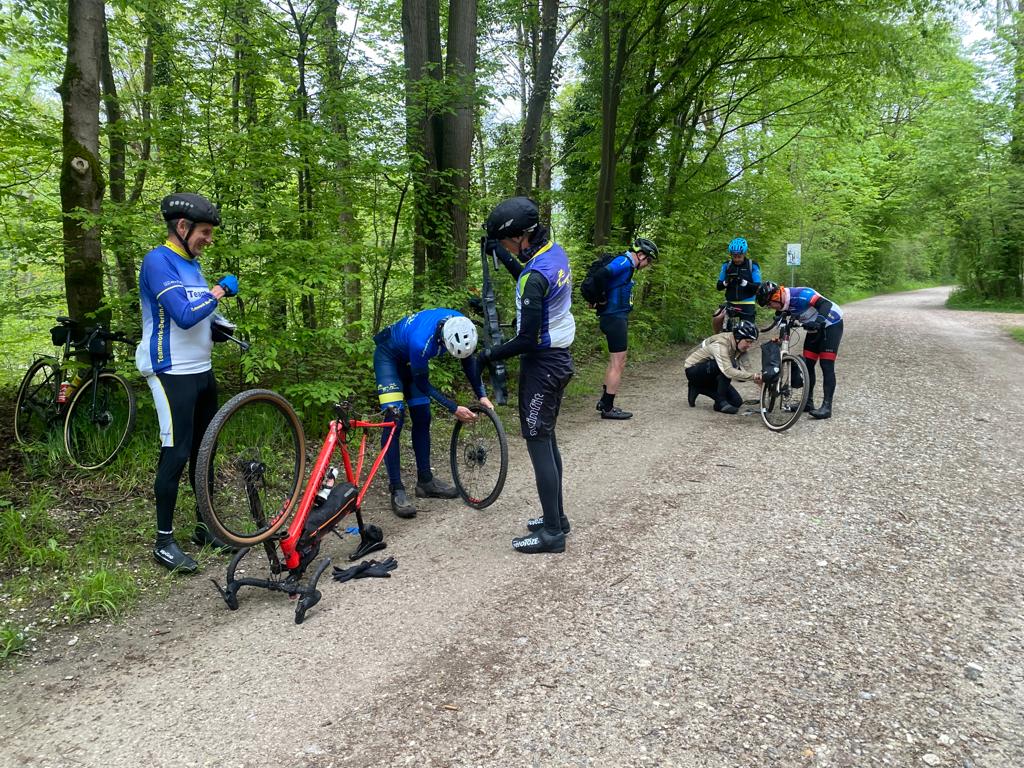 Der Weg führte uns bei rund 10 Grad, starker Bewölkung und leichtem Niesel direkt zur Isar, wie es sich gehört auf unbefestigten und häufig auf Schotterwegen. Die obligatorischen Reparaturstops wurden in der ersten halben Stunde absolviert, Thilo mit Kettenproblem, das er händisch auf (für mich) wundersame Weise mit allerlei feinmotorischem Einsatz von intrikatem Werkzeug löste – was man so alles dabeihaben kann – und Kai mit einen schlappen tubeless-Reifen, den er behende auswechselte, allerdings erst nach Freisetzung seiner fahrradmechanischen Fähigkeiten durch ein kurzes, herzhaftes Fluchen.