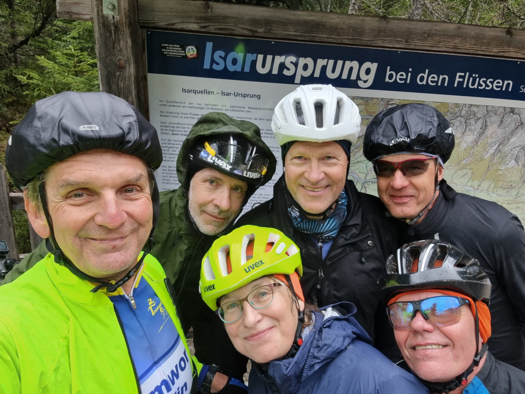 Im weiteren Verlauf genossen wir Blicke über die urwüchsig-natürliche Isar-Flusslandschaft bis Mittenwald, vorbei an der Kaserne der legendären Gebirgsjäger. Danach war es zwar immer noch nicht trockener und wärmer, aber die Elite (Thilo, Cornelia und Kai, Klaus, Dietrich und Dietmar) spornte das umso mehr an, die Tour noch mit dem Anstieg zur Isarquelle zu krönen.