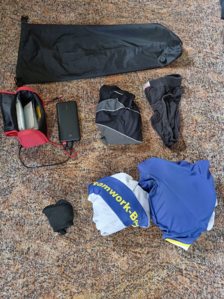 In die Satteltasche kommt ein Ersatztrikot und ein Täschchen zum Übernachten (Zahnpasta, etc)