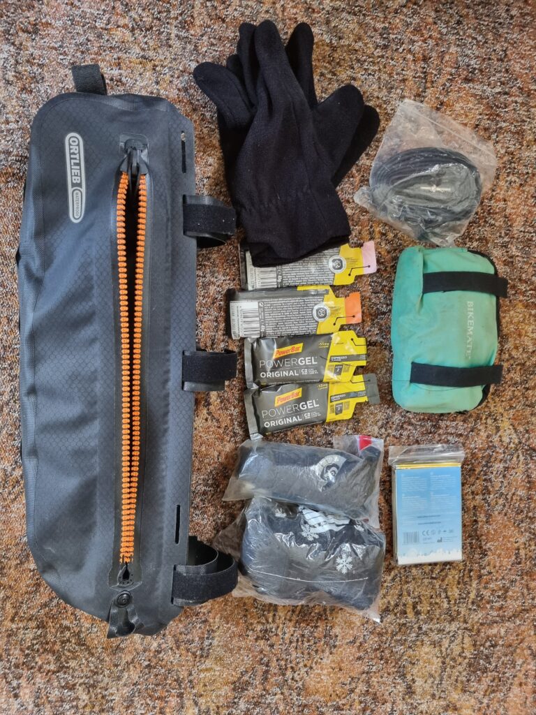 Die Rahmentasche mit Werkzeugtasche, Ersatzschläuchen, Kältevorsorge und Ersatzverpflegung