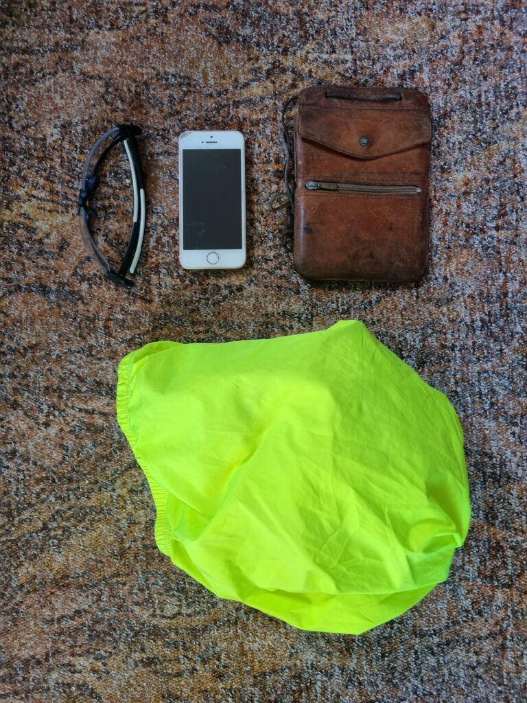 Direkt am Mann: Geld, Handy, Brille. Die Jacke ist entweder im Trikot oder auf der Satteltasche.